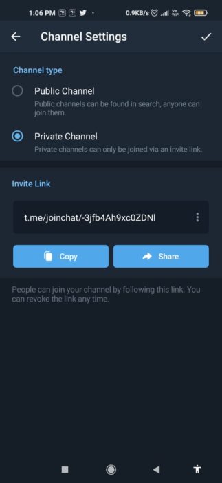 5. When creating a public channel, you will need to come up with a public link (unique), whereas a private channel will give you an invite link.