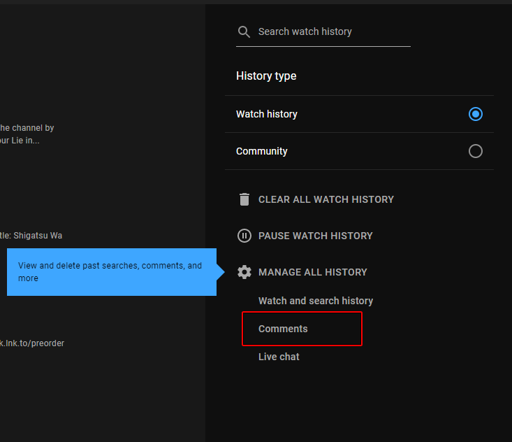 5. Similarly, you’ll see your YouTube watch history on the newly opened page. On the right side, click on the Comments button.