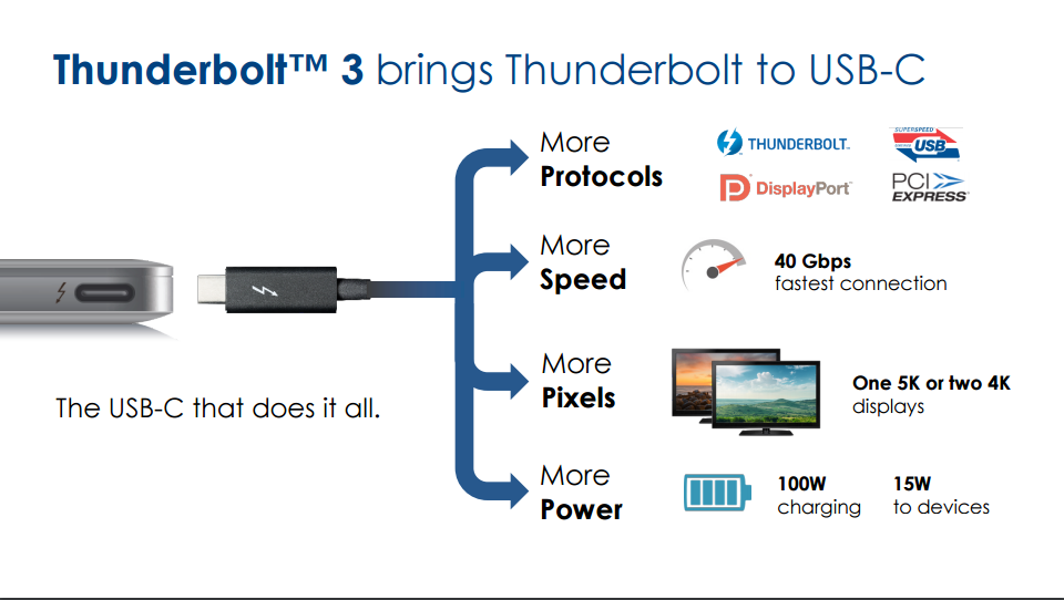 Thunderbolt 3 is capable of delivering theoretical transfer speeds up to 40Gbps. It uses the standard USB Type-C port, thus, reducing the need for an extra port on the device. While charging devices, Type-C port can deliver around 100W. As far as external display support is concerned, you can connect up to two 4K monitors to a single Thunderbolt 3 port.