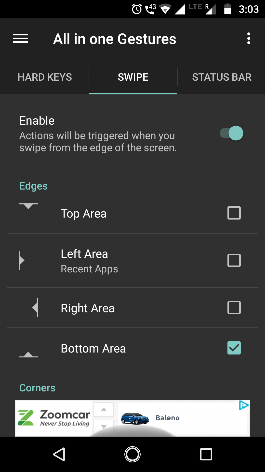 The app offers many swipe gestures which work along the edges and corners of the devices. Similar to the case of physical buttons, each swipe gesture can be configured to open apps and navigate. In total, you can add 12 swipeable hotspots (by tapping the three dots on the top right corner) which will also add diagonal swipe gestures.