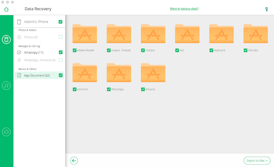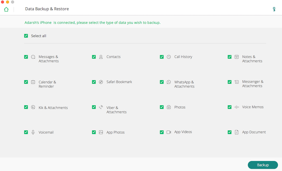 The third biggest feature of iSkysoft Toolbox is pretty straightforward and useful. After choosing this option, you’ll be shown different file types to choose from. You can select the file types as per your convenience and press the Backup button at bottom right. Doing so will start the backup process. The progress of the backup will be shown in a progress bar. After that, you’ll need to export the backup file to your Mac.
