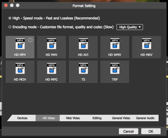 After doing that, you have to select the Output Format. In case you don’t have time and you just wish to split the video in the original format, choose the High Speed mode for lossless conversion. If you wish to define the output format, you need to choose Encoding Mode. There are also options for selecting pre-defined devices, Web Video, HD Video, General Video, etc.