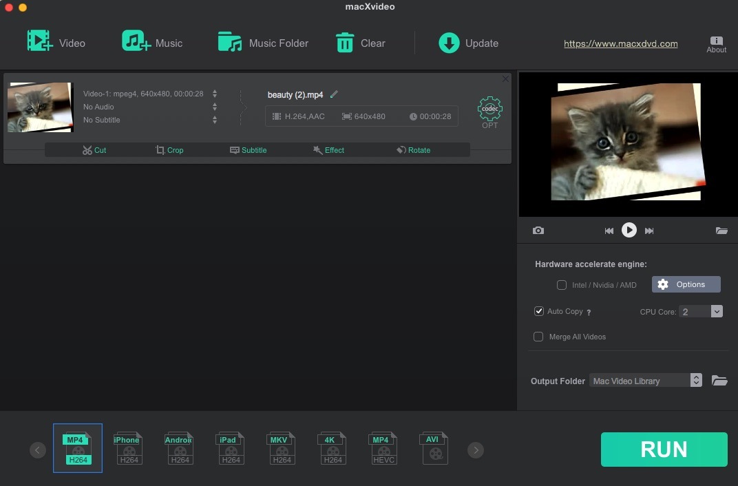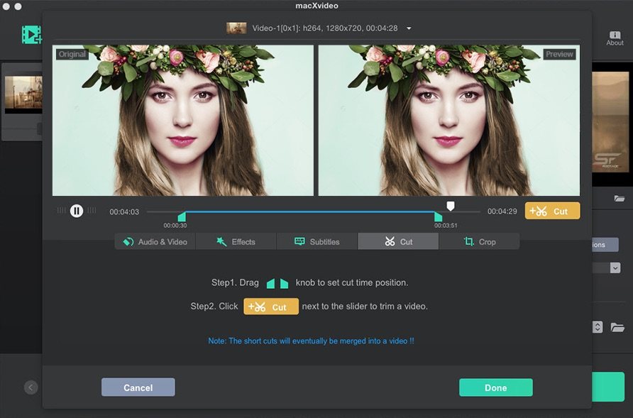 macXvideo is such a handy tool to trim, crop, rotate, merge, add effect for free. It solves all your problems on how to edit videos on Mac easily in one click, rather than the complicated and tedious steps using other complicated video editing tools. After the video is loaded, all the editing options are visually displayed below the video information. You can directly tap on the corresponding options to cut your 4K ultra HD video recordings to save your favorite clips, crop video dimensions to meet the specific aspect ratio requirements of different sites, rotate videos into the right direction, merge excellent video fragments together, add subtitles and add effects for different color grading. The editor is designed for the fast and convenient video editing and all the operations can be finished in just a few clicks.