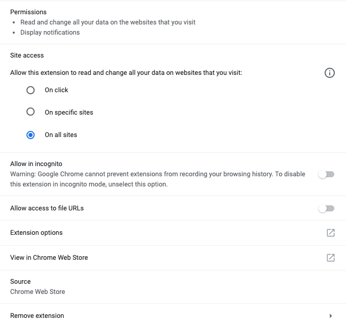 An important Chrome extension settings to look out for in this section is “Site Access.”