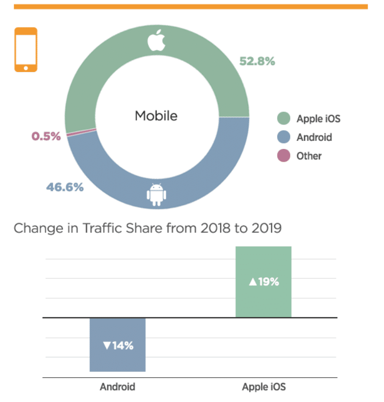 When considering the traffic from mobile devices, it was revealed that iOS users account for 52.8% of the mobile traffic while Android users could make it to 46.6%. Thus, iOS users have outperformed Android users when compared to 2018.