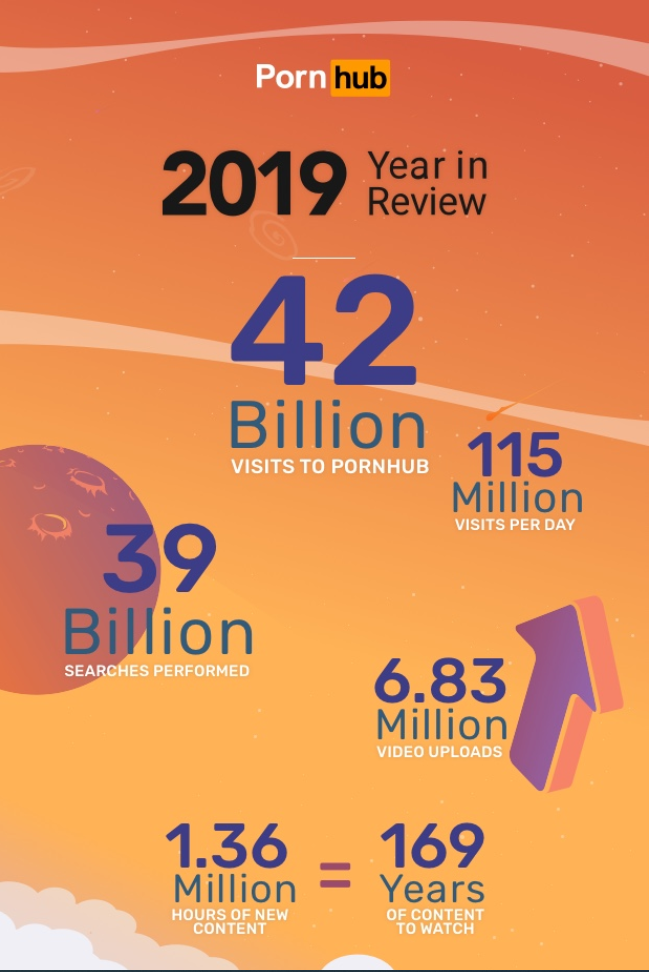 Furthermore, around 6.83 million videos were uploaded in 2019 which is equivalent to 169 years of content. Pornhub suggests that if one wants to finish all of them, they should have started in the year 1850.