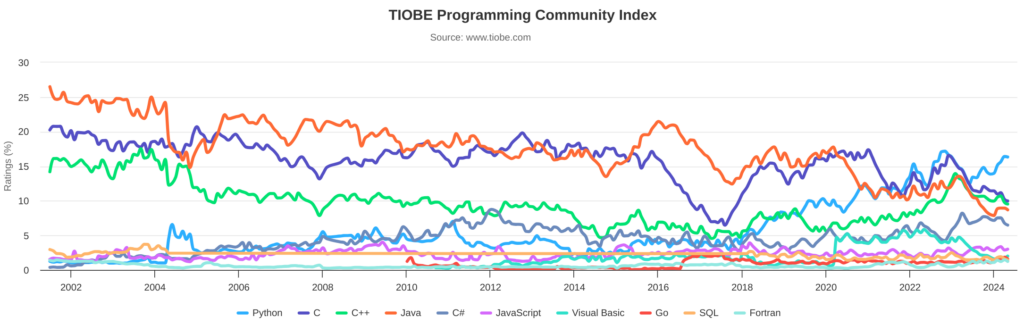 The selection of top programming languages is based on data collected from the TIOBE Programming Community Index; TIOBE Index is an indicator of the popularity of programming languages that gets updated monthly.