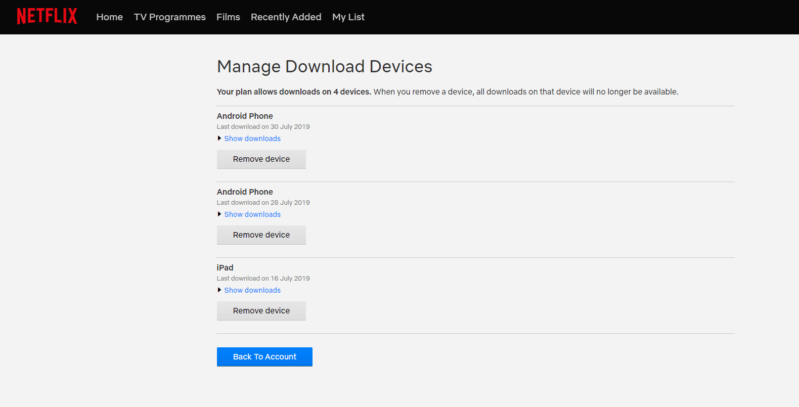 Here you can find the list of devices that have Netflix downloads. You can click on Remove Device to delete any of them.