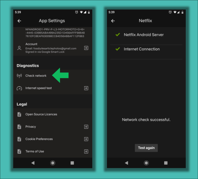 Go to More > App Settings > Scroll down to find the Check network option. You can use the tool to find out if the Netflix app can connect to the internet and communicate with the Netflix servers properly.