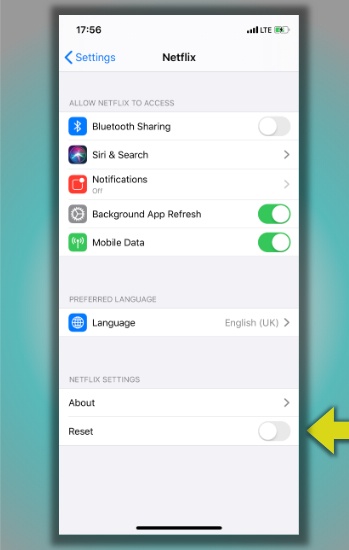 - Tap on the Reset toggle button at the bottom of the Netflix app page.
