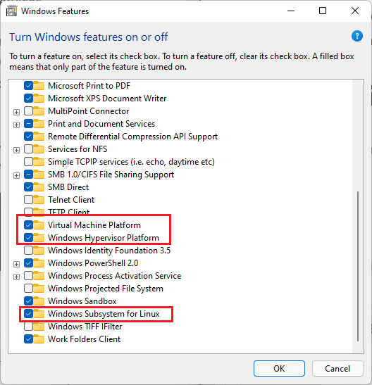2. Type “Turn Windows features on or off”, and in the dialog box enable Windows Subsystem for Linux, Windows Hypervisor Platform, and Virtual Machine Platform.