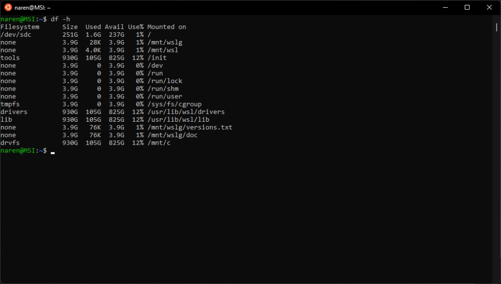 1. You can verify this by running the df -h command to list all disks and their mount points. In this example, we have a single C drive, which is mounted on /mnt/c via DrvFs