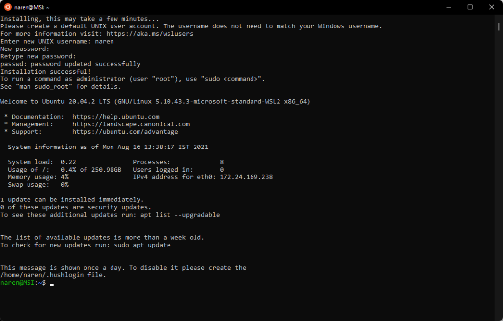 The WSL 2 Ubuntu instance is now ready for use.