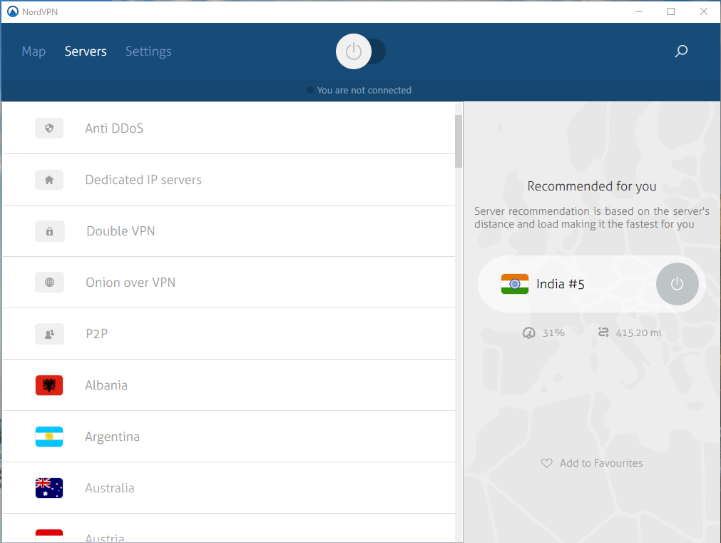 The first big thing you’d notice after you enter your login credentials in the NordVPN app is a world map featuring various blue-colored markers which depict the countries where NordVPN’s servers spread across the globe.