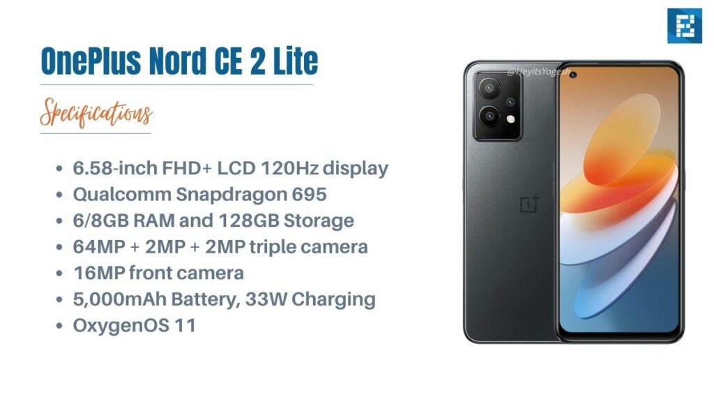 OnePlus Nord CE 2 Lite is a 6.58-inch phone whose LCD panel supports a 120Hz refresh rate. At the heart of the device is a Qualcomm Snapdragon 695 processor. The device is packing 6/8GB RAM and 128GB storage. It is also packing a 5,000mAh battery that supports 33W fast charging.