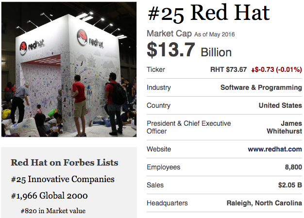 Interestingly, Red Hat is the only open source software company on Forbes’ World’s Most Innovative Companies list.