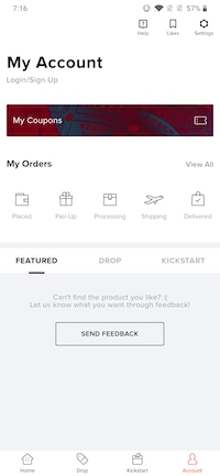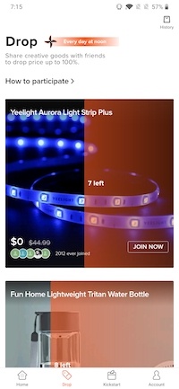 - The Drop section displays products which when shared with friends, will provide up to 100% discount to the users.