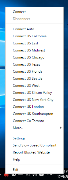 You can right-click the PIA VPN icon to connect to VPN servers in various countries from the list or let the app choose some random server automatically using the ‘Connect Auto’ option. The ‘Connect’ option at the top of the list will connect you to a server in the region you’ve chosen as default in the Settings.