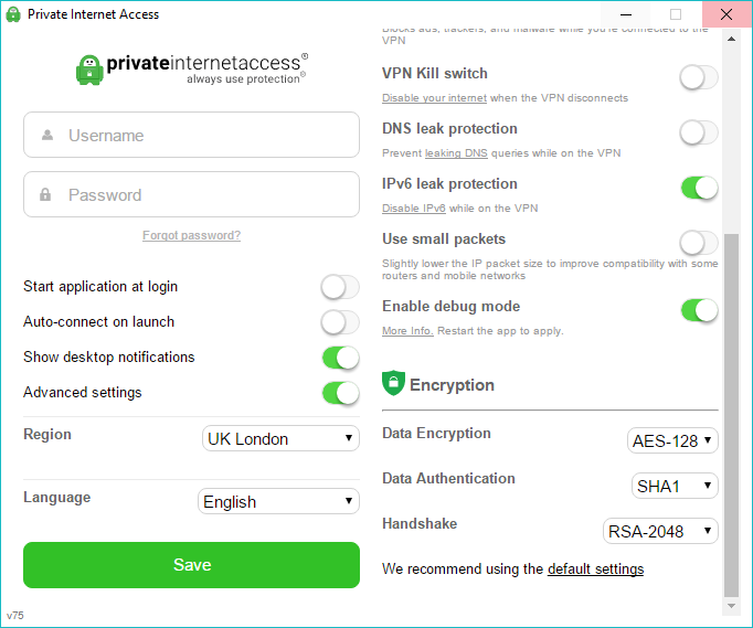 You can also enable and disable other features such as VPN Kill Switch, DNS Leak Protection, IPv6 leak protection, etc. The app can also reduce the size of data packets to improve compatibility with a wide range of routers, possibly older ones. The ‘Enable debug mode’ option allows the PIA to gather data about performance, attempts to connect to the VPN, and save it to a local log file.