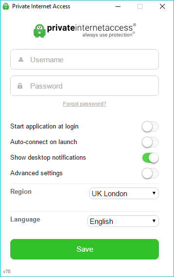 When you visit Settings, you can toggle basic options, such as, whether to start PIA at login, auto-connect at launch and show desktop notifications. You can set the default country for the PIA VPN from the Region drop-down menu.