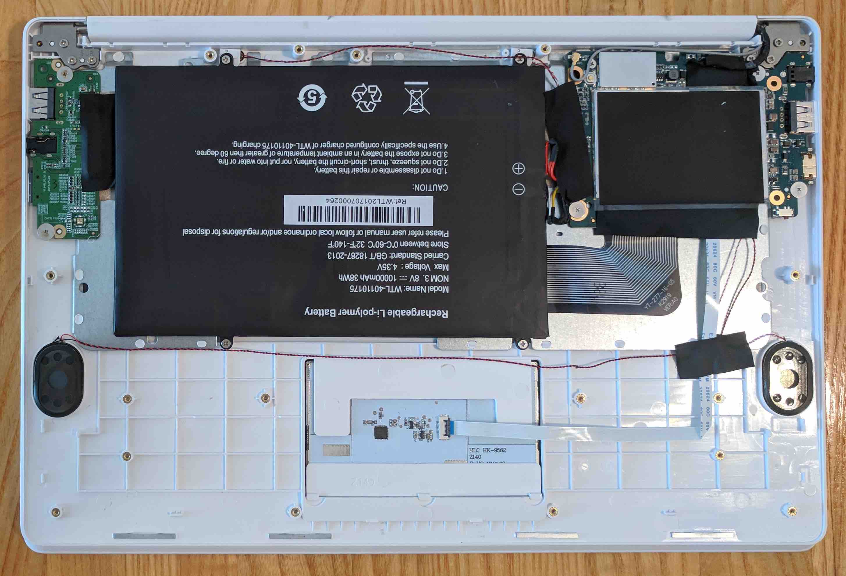 There are two USB 2.0 ports, a microSD card slot, HDMI mini, and a headphone jack. The device is powered by a 5V DC barrel jack (although, USB micro would have been nicer) that is rated for 3A, meaning that the laptop is on par with many tablets in terms of power draw, which is natural given its ARM CPU.