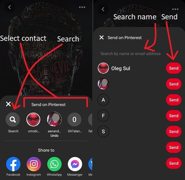 3. a) Next, horizontally scroll on the friend list and tap on the Pinterest friend whom you want to send the post (also, you can tap again to “unsend” it). Alternatively, you can click on the magnifying glass icon, search your contacts from the list, and tap “Send.”