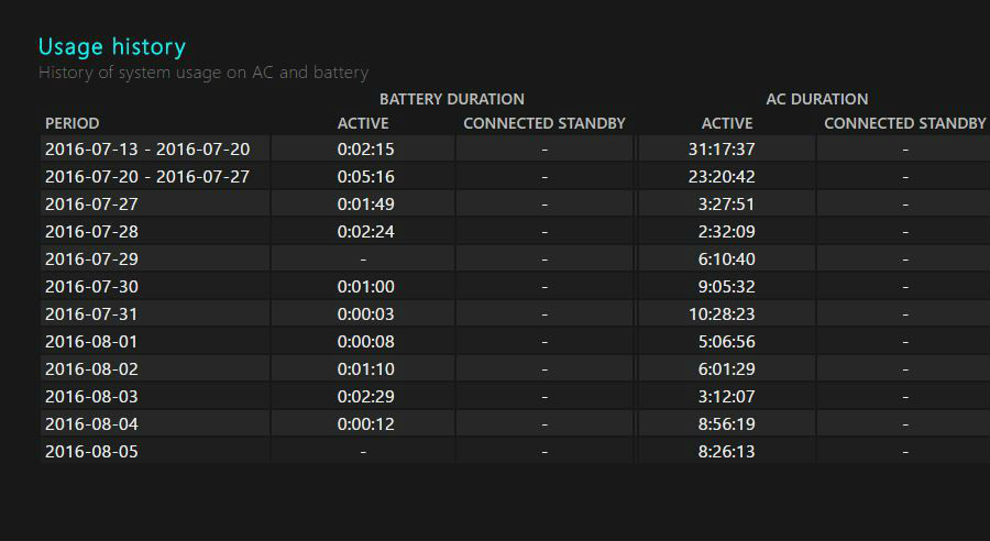 The battery report looks less geeky and includes information about day-to-day battery usage. It displays the recent usage stats and graph for the past three days, battery usage history of how many hours the system was active per week, and per week battery capacity history to give an idea of how much it has depleted in comparison to the original capacity.