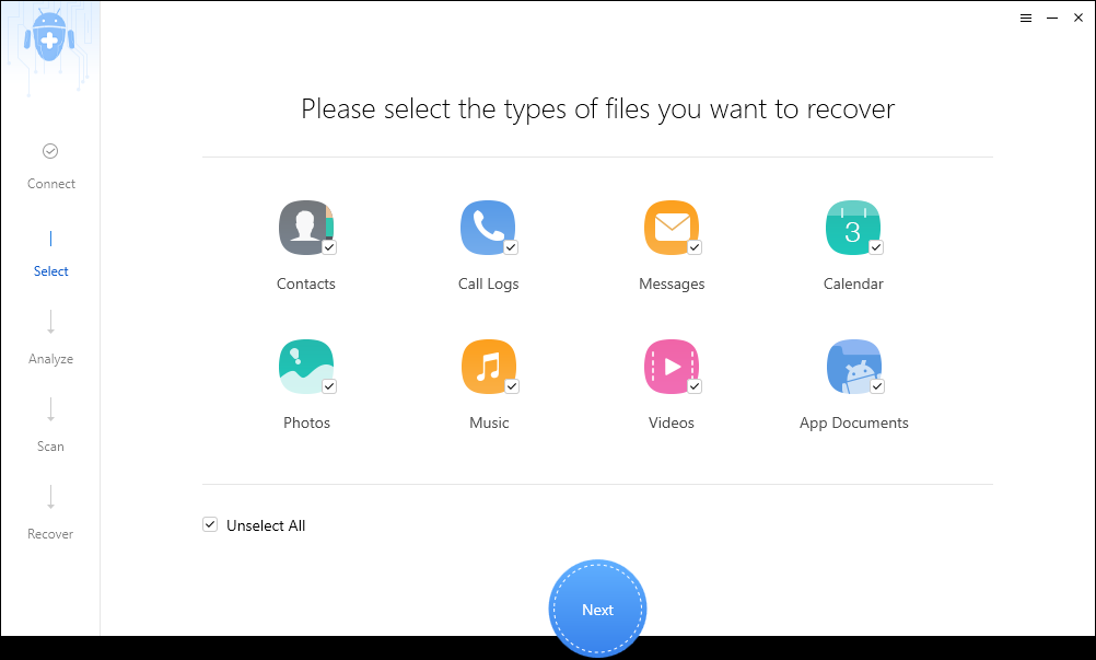 Once the device setup is complete, you’ll start seeing different categories of data the software can recover. Check one or more as per your requirements.