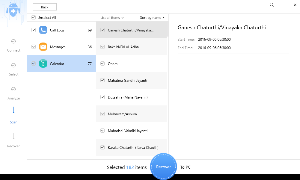 Using Primo Android Data Recovery is a fairly simple task. The step-by-step wizard offered by the software makes it quite an easy task to select what to recovery, and review the details before the data is finally copied to your PC’s hard drive.