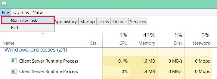 - On Task Manager, go to File > Run new task. Type e xplorer.exe and press enter.