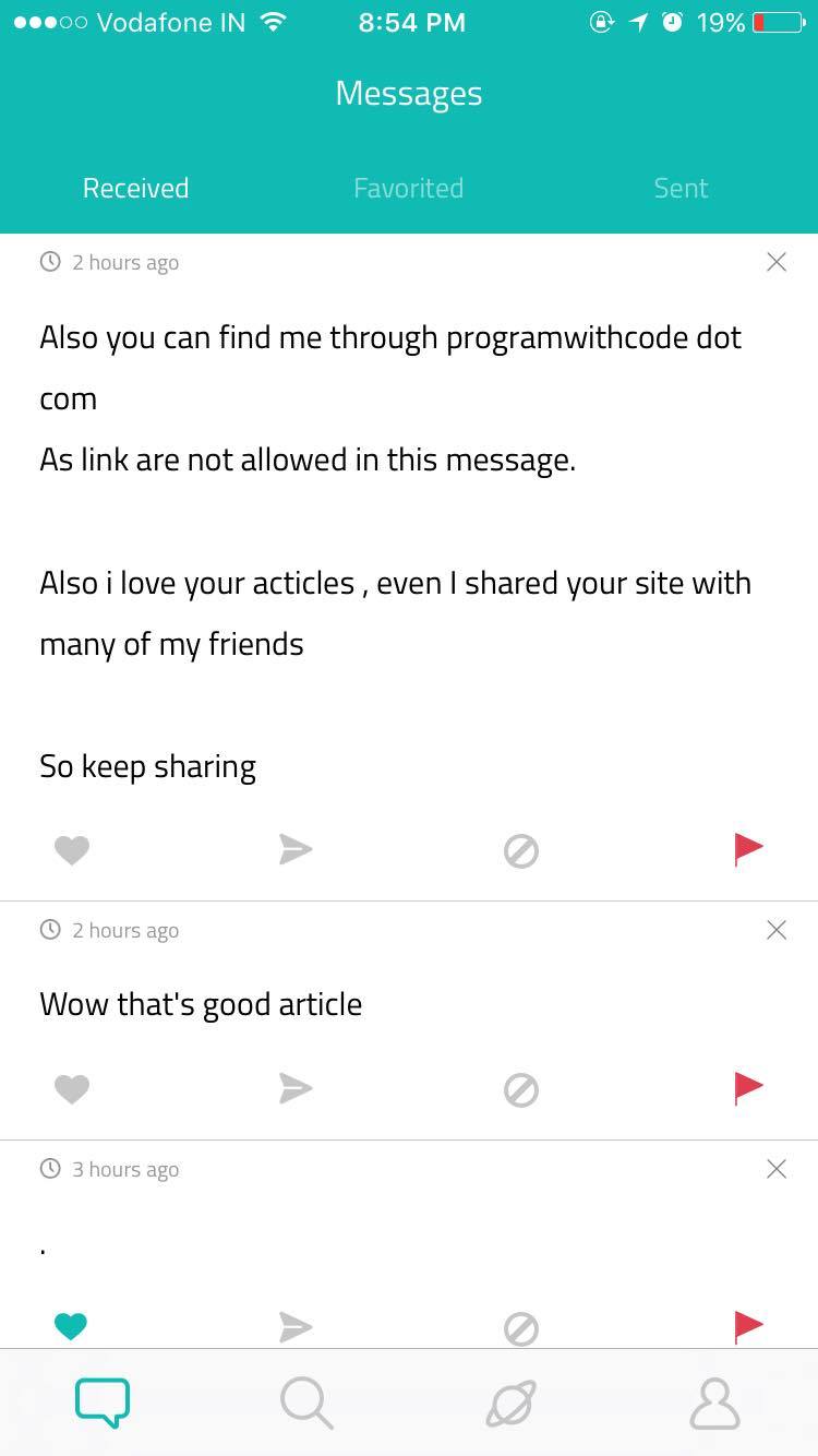 The primary Message window of the app has three different tabs at the top. From there, you can see the messages that you’ve received, marked favorite, and sent to others. At the bottom, there are four options to choose from. Apart from the primary Message window, the other options are of Search, Explore, and Profile. The Explore is marked as a new feature that’s under development.