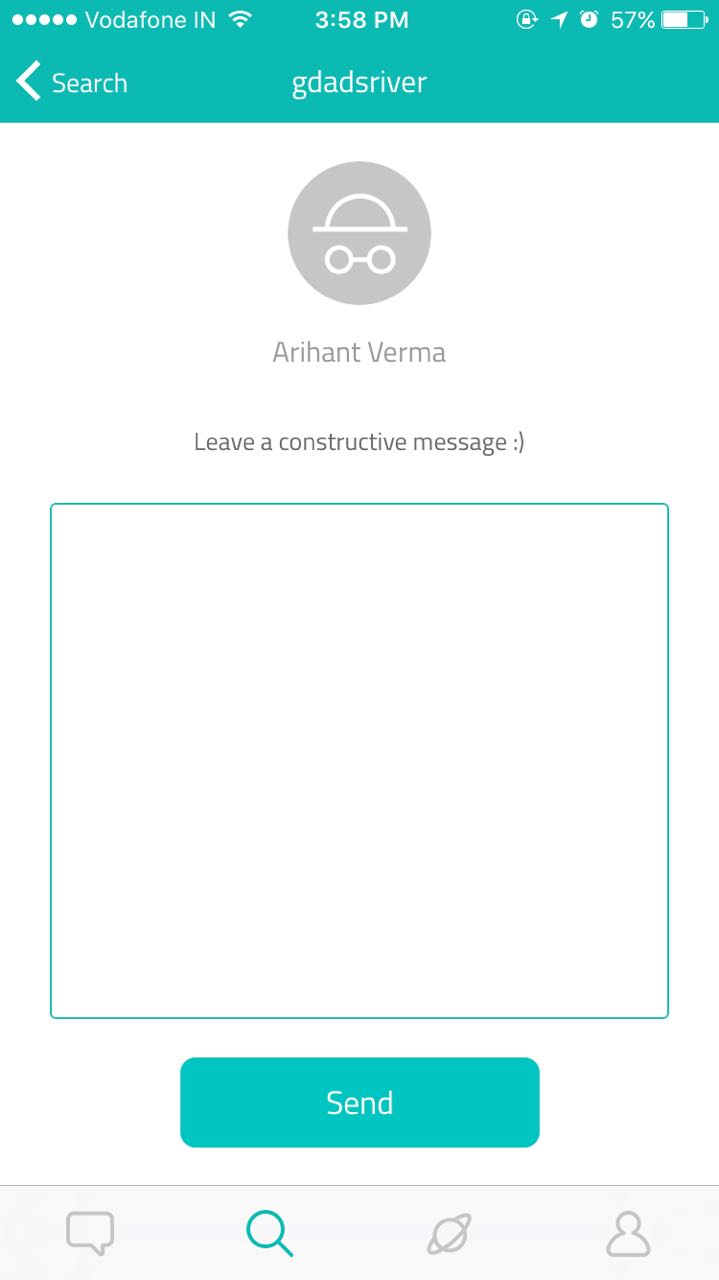 After searching for a friend, you can select the profile and tap on it to open a new message box that asks you to leave a “constructive message.” You can only send text messages; no option to share photos.
