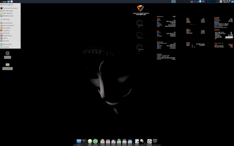 By running a Kodachi system with active VPN connection, TOR, and DNScrypt service ensures a good level of privacy. All the connections to the internet are forced to pass through the previously mentioned services. The entire operating system runs from your volatile RAM memory, so after shutting down no trace of activity is left. Kodachi Linux also ships with latest privacy tools for emails, encryption, and instant messaging. The Xfce desktop environment makes it even more useful on older machines.