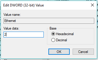 Now, double-click the Ethernet registry entry and change it’s value to 2. It won’t give an error. Click