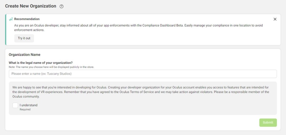 You need to register as a developer to allow installing apps & games to your headset. To do this, go to the Developer dashboard on your PC and log in to your Oculus account.