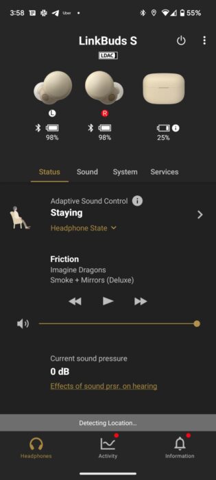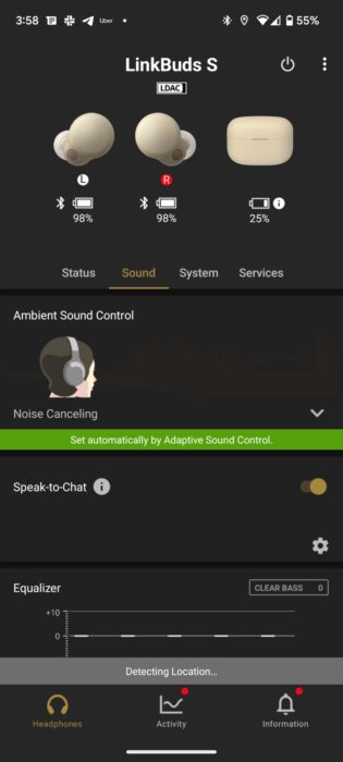 The app and features work great. The home page houses the battery percentage of the earbud and the case alongside the current active codec. Below that, you get Adaptive sound control, media buttons, and a “current sound pressure” reading, which we’ll talk about in a bit.