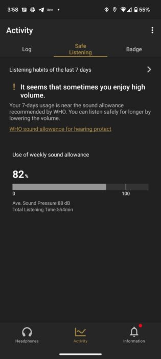 I’m not sure if the Safe Listening feature is exclusive to the WF-LS900N, but it does a great job of reminding you when you’re way above the recommended listening sound pressure. It calculates the average decibels and shows whether your 7-day usage is near what WHO recommends. Very cool. Overall, I’ve had no issues using the app. Also, if you’re on Android 13, the battery widget works.