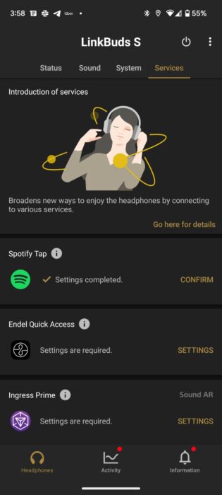 The System tab houses the option to enable multi-point connectivity and the option to edit the touch controls. It also contains the “Determine Optimal Earbud Tips” option to test if you’re wearing the right size of ear tips for your ears. The WF-LS900N also supports Spotify tap, where you can double-tap one side of the earbud to quickly start playing music on Spotify.