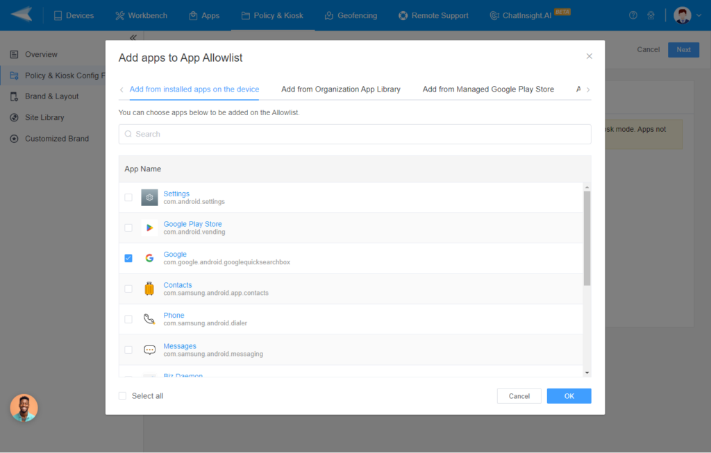 To implement multi-app kiosk mode, select the ‘App allowlist for kiosk’ option and add a list of apps you want to configure on managed devices.