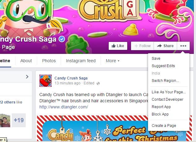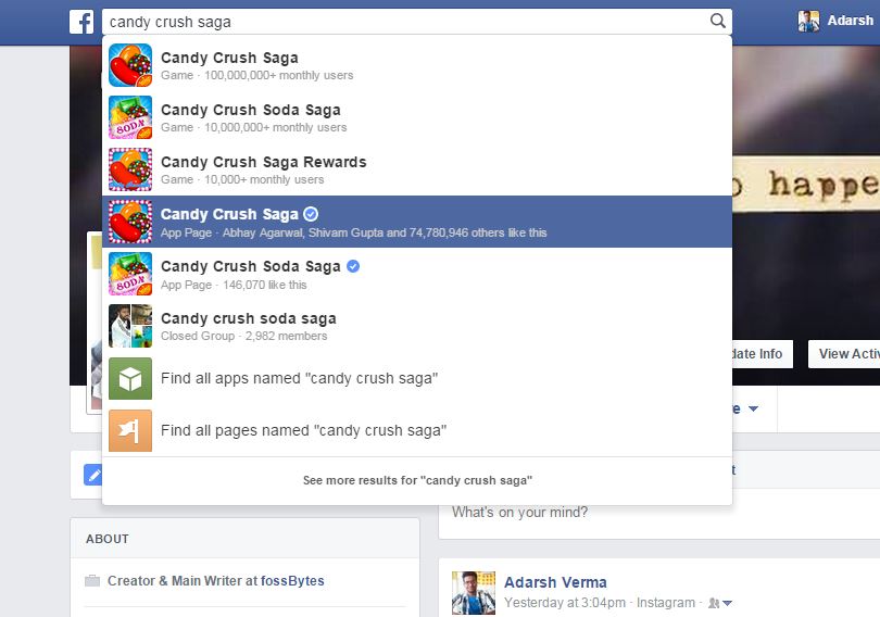 - Login to your Facebook account and search for Candy Crush Saga app page (don’t click the app).