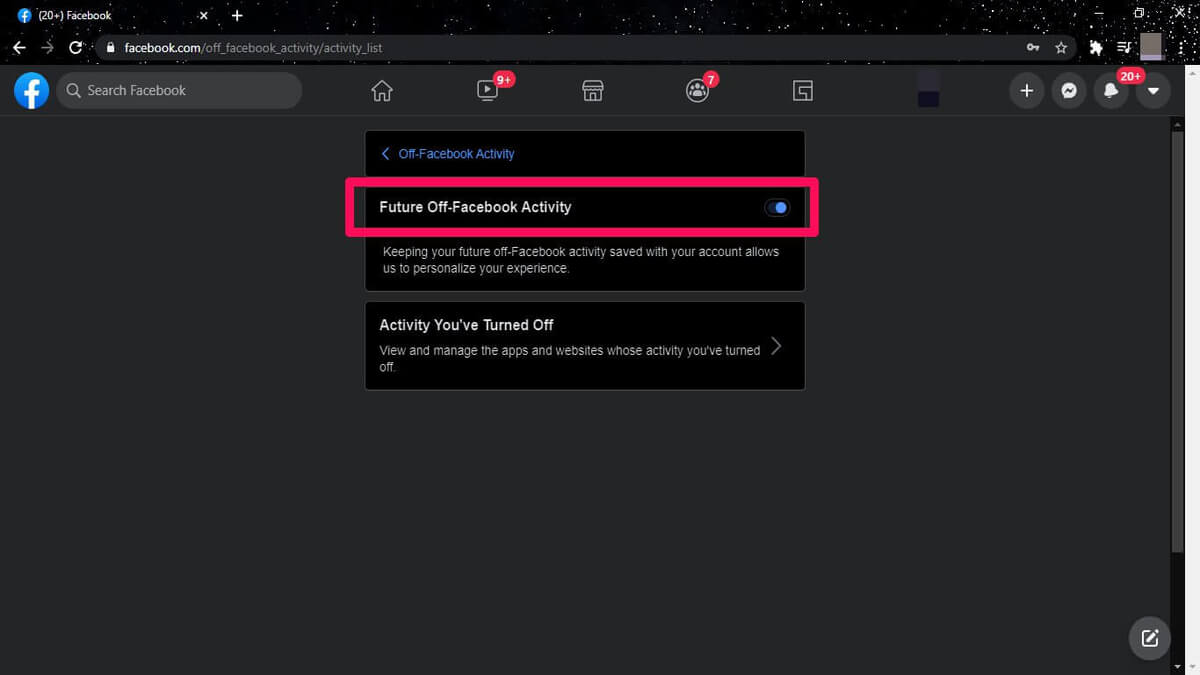 Follow these steps on a web browser to disable the Off-Facebook Activity feature: