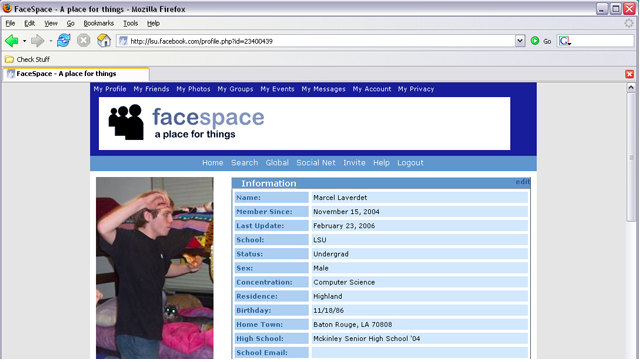 So the first generation of the worm had three symptoms when you viewed an infected profile: (a) It friended my test account; (b) It re-styled the profile to look like MySpace; (c) It copied itself to your own profile.