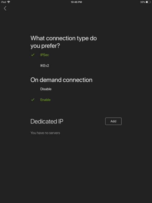 The Settings screen allows you to choose between VPN protocols, enable or disable on-demand connection, and set up dedicated IP address.