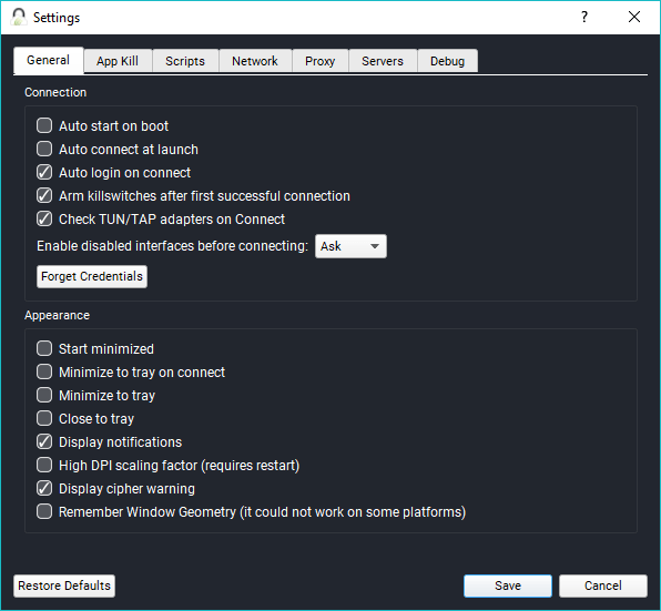 Under the General tab, you can manage actions associated with the startup, minimize, notifications, connection, etc. You can also ask the app to forget the login credentials and restore the settings to default.