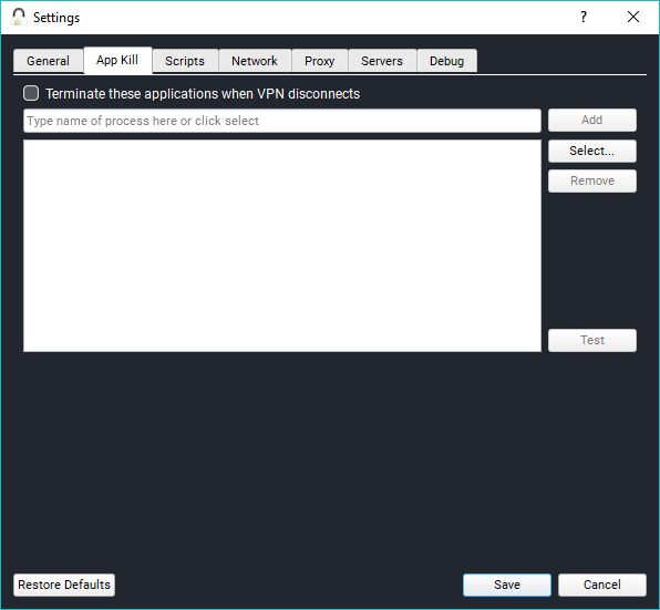 The App Kill tab allows you to select the name of the apps and process, which need to be terminated when the VPN service faces a blackout. This helps the traffic related to these apps from being exposed to the regular internet.