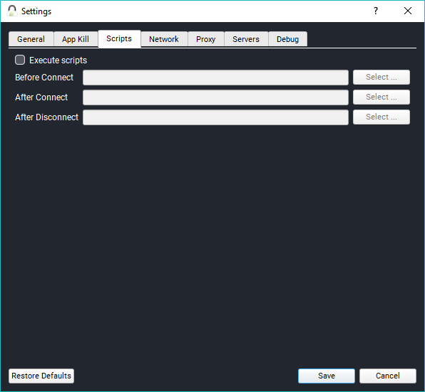 The TorGuard VPN also allows you to automatically run batch files, bash scripts, VB scripts, etc. You can set them to run before, after connecting, and after disconnecting the VPN service.