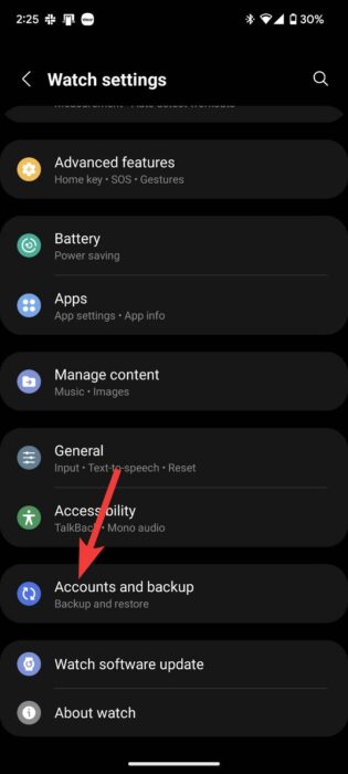 1. Back up all your watch data by opening the Wearable app on your phone and going to Watch Settings > Accounts and Backup > Back up data.