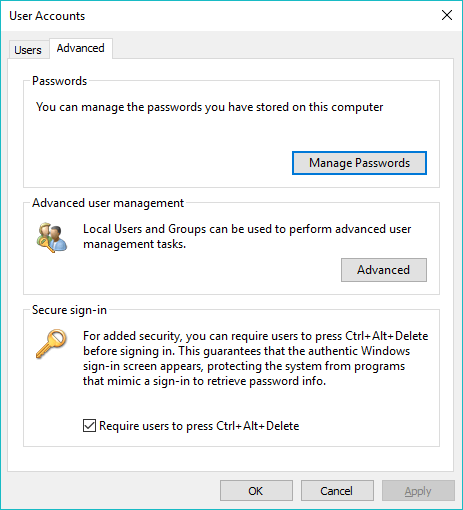 You can add the secure sign-in screen to your Windows PC. Open CMD and run the command netplwiz . In the User Accounts window, go to the Advanced tab. Under Secure sign-in, tick the checkbox that says “Require users to press Ctrl+Alt+Delete”. Click on Ok to save the changes.