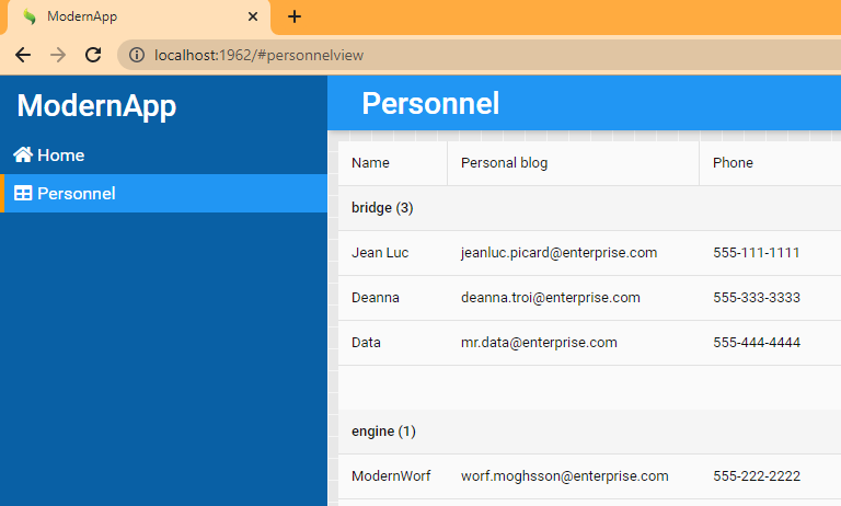 With four lines of code, it was possible to create a complete project with a home page and a grid for personal information. It has columns for name, email, and telephone.