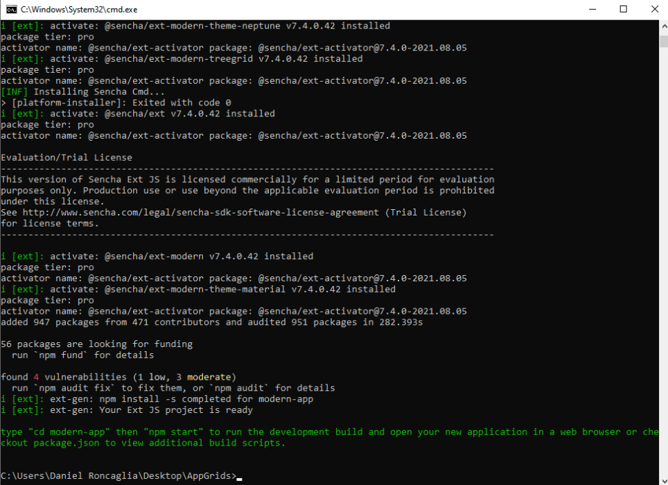 With the Ext JS Sencha package installed, the following command allows you to create a project with a simple home page view and a grid.
